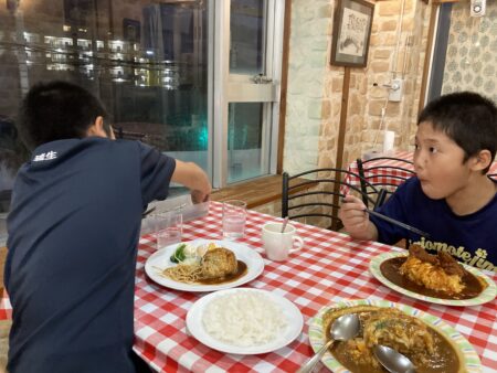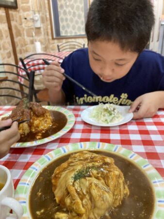 三男、大きなカツが乗ったオムライスを注文してバクバク食べていました。