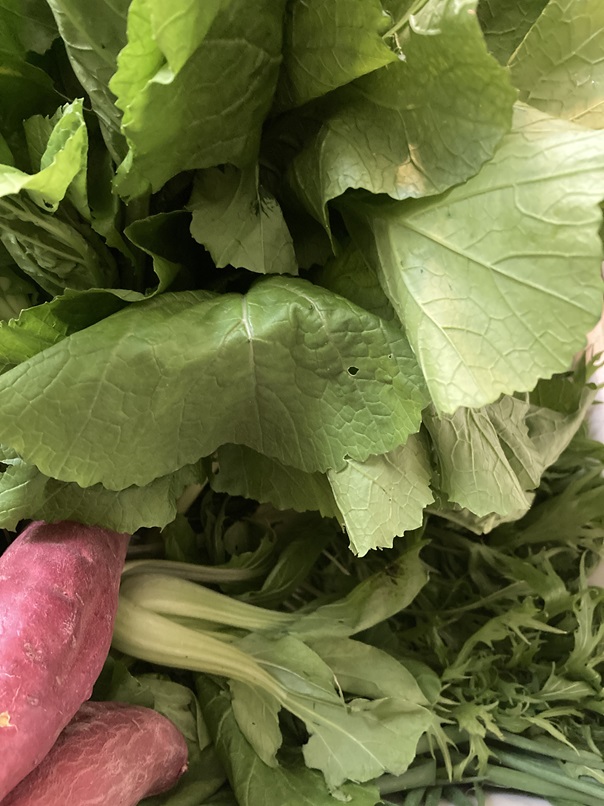 カラシナ・水菜・さつまいも・青梗菜・ネギ。