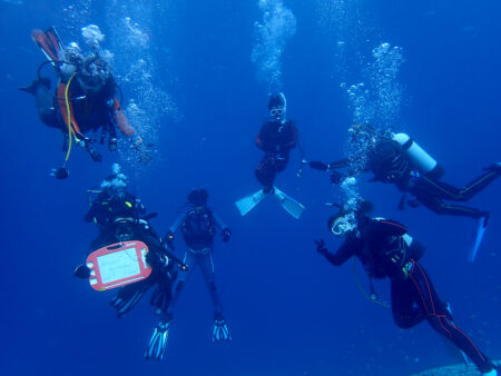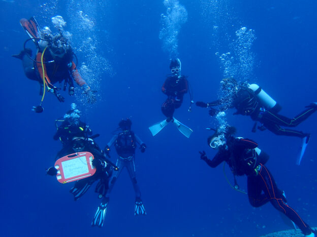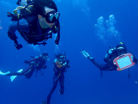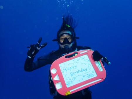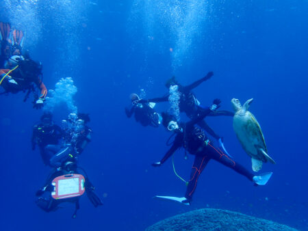HappyBirthday お誕生の方がいらっしゃいました~。 おめでとう!! みんなでお祝いです。 揃って撮ろうと思ったらアオウミガメも入ってきました。 大学のダイビングサークルの仲間。 これからもみんなで楽しく潜ってねー!
