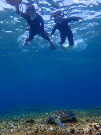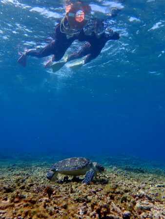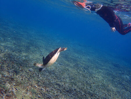 呼吸に上がってきたカメが水底へ戻っていきます。