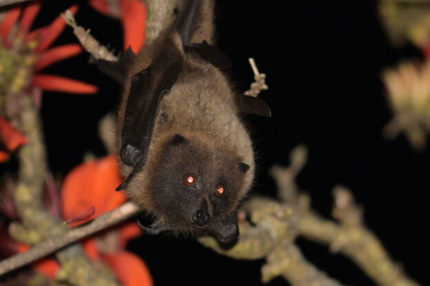 デイゴの木には蜜を吸いに来たヤエヤマオオコウモリ。