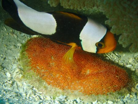 トウアカクマノミがキレイなオレンジ色の卵を産んでいました。