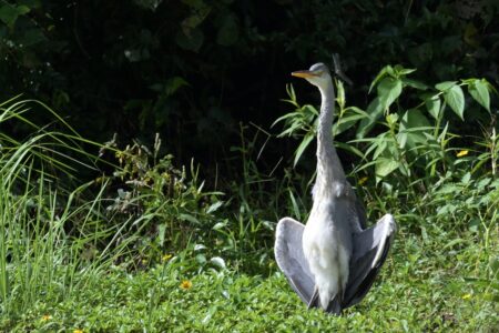 羽を乾かしているアオサギ。